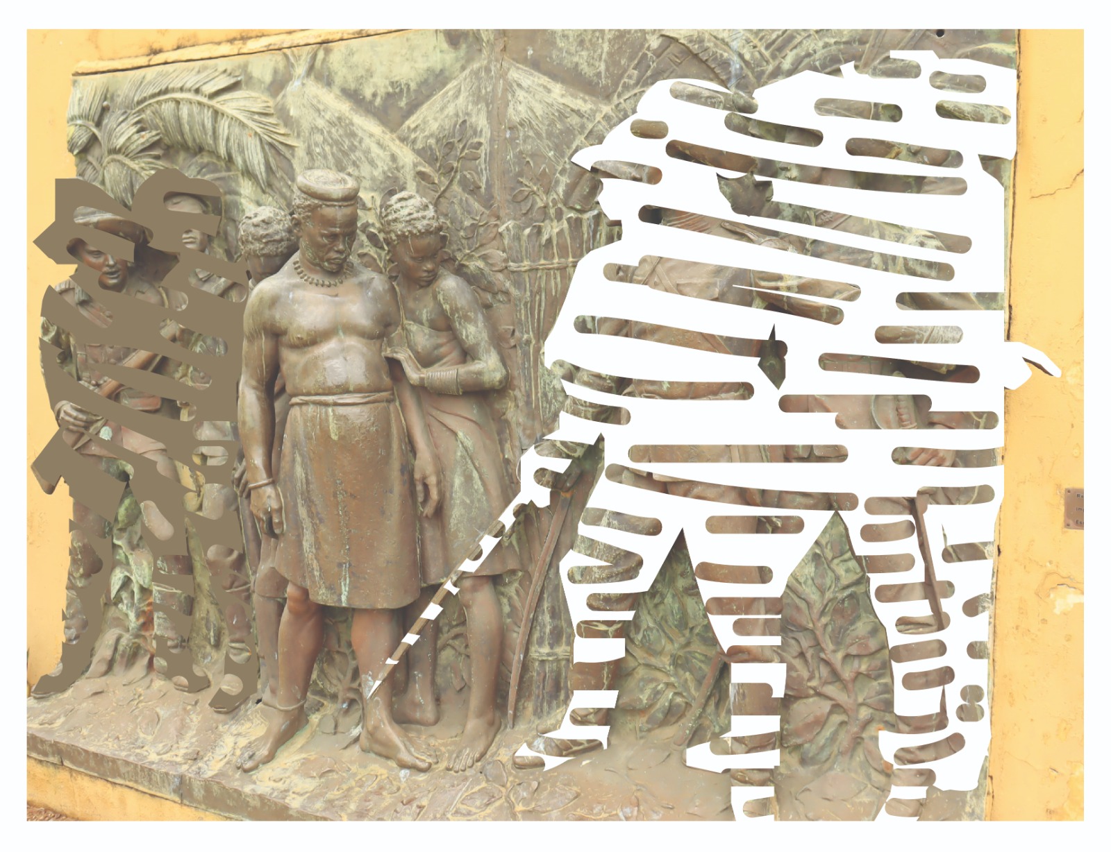 Fig.group 1: Titos Pelembe, “Decapture Ngungunhane protected by the Queens of the Gaza Empire” (2025). Digital intervention on a photograph of the colonial monument exhibited at the Fortress of Maputo.