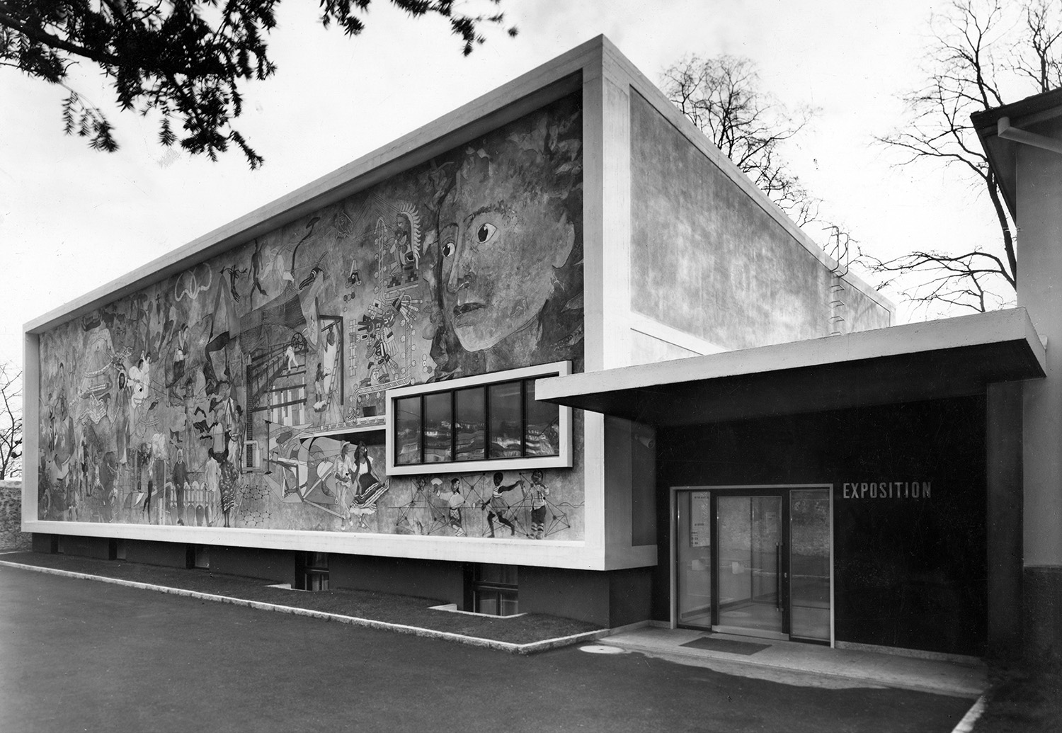 Fig 0. Vue de la façade nord du Musée dynamique de Neuchâtel construit par les architectes Jean-Pierre et Renaud de Bosset, avec la peinture murale de Hans Erni Les conquêtes de l’homme. 1955 Photographie Walter Hugentobler © Musée d’ethnographie, Neuchâtel.