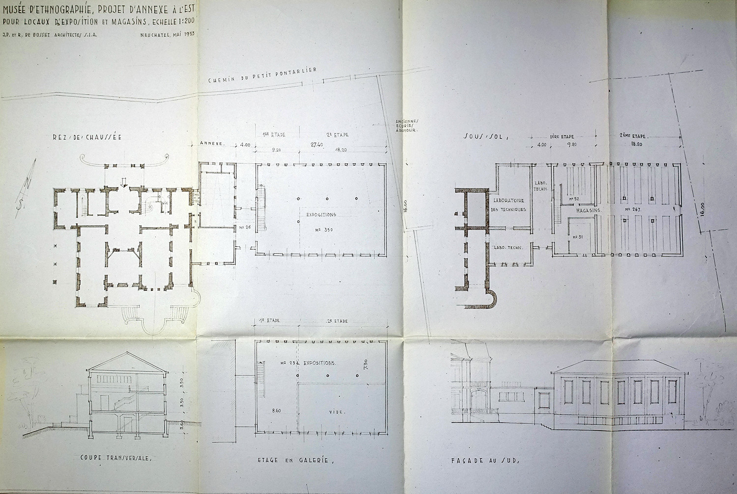 Fig 5. Plan Musée d’ethnographie, Neuchâtel, Projet d’agrandissement, 1953, Jean-Pierre et Renaud de Bosset, juillet 1953. Archives Musée d’ethnographie, Neuchâtel.