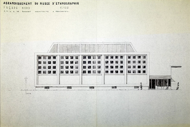 Fig 2. Élévation Agrandissement du Musée d’ethnographie, façade nord, 1 :100, Jean-Pierre et Renaud de Bosset, février 1954. Archives Musée d’ethnographie, Neuchâtel.