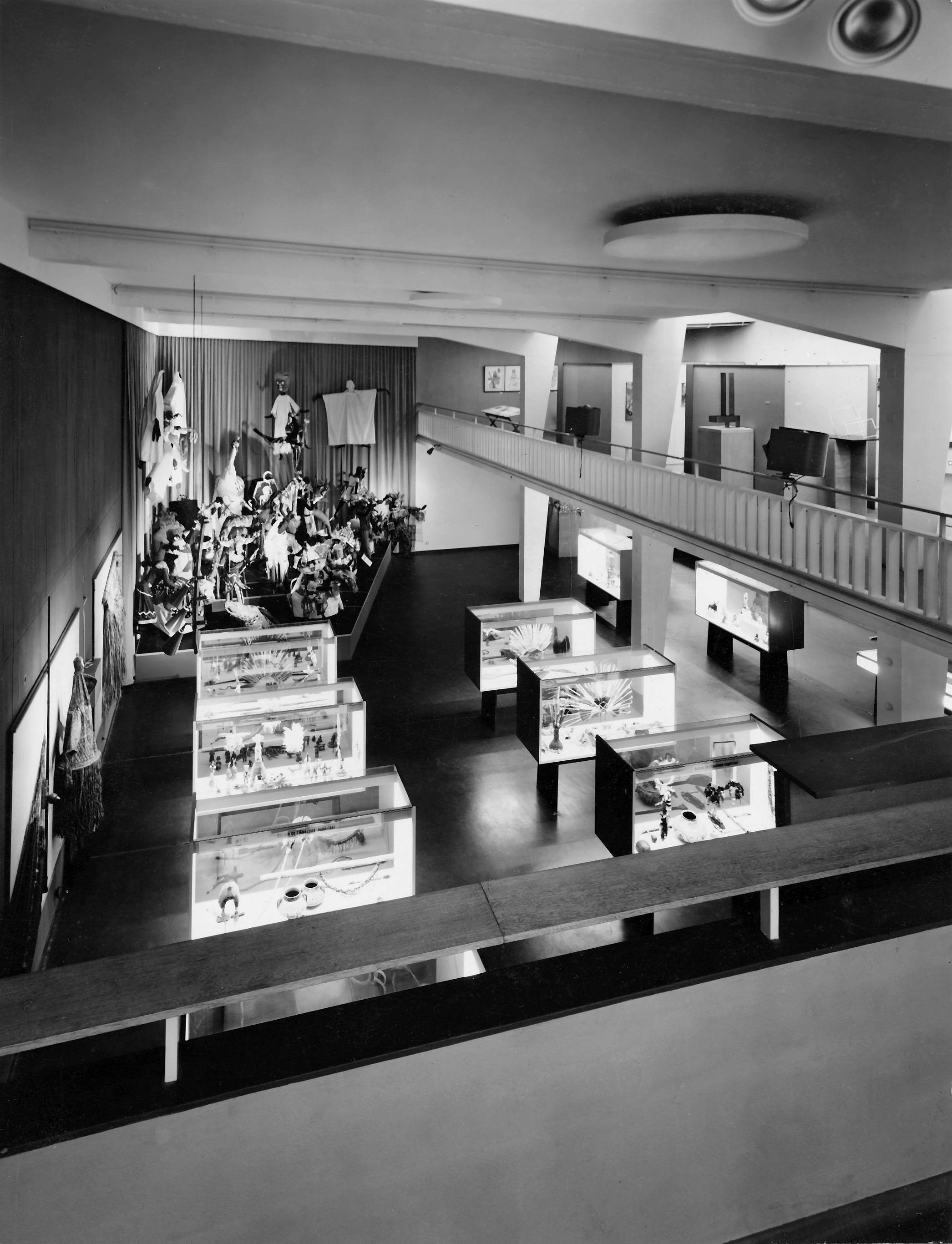 Fig 3. Vue depuis la galerie de la salle d’exposition du Musée dynamique lors de l’exposition inaugurale Brésil de la plume au gratte-ciel avec le système mobilier d’agencement d’exposition dessiné par l’architecte d’intérieur Robert Strub, Neuchâtel, 1955. Photographie Walter Hugentobler © Musée d’ethnographie, Neuchâtel.