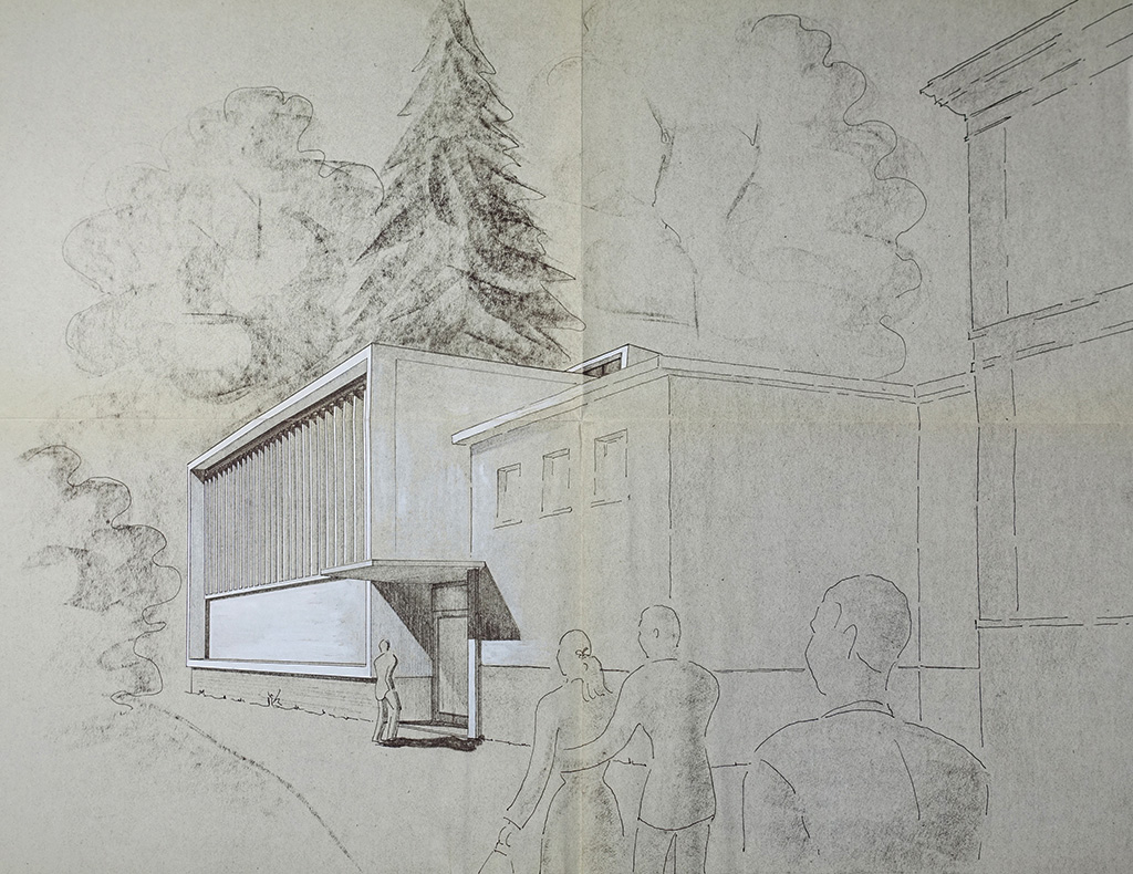 Les premières esquisses de l’extension examinées par Rivière n’ont pas été conservées. Elles sont réalisées par l’architecte neuchâtelois Maurice Billeter auquel les autorités ont confié la réalisation des premières études. Etant donné l’étendue des travaux qui comprennent à la fois la réfection de la Villa de Pury, l’aménagement des écuries en laboratoire21 et la construction d’un nouveau bâtiment, Jean Liniger, conseiller communal et directeur des musées, propose à Maurice Billeter de faire deux lots de cette étude et d’y intéresser un second bureau d’architecte22. Alors que Maurice Billeter se concentre dorénavant sur les travaux de la Villa, le Conseil communal confie en février 1953 à Jean-Pierre et Renaud de Bosset l’étude d’un avant-projet de bâtiment d’expositions avec magasins23. Le duo a déjà de l’expérience dans la réalisation d’architecture d’exposition, ayant notamment assumé les plans et la réalisation de l’Exposition suisse de Porto organisée par l’Office suisse d’expansion commerciale du 18 mai au 3 juin 194524.