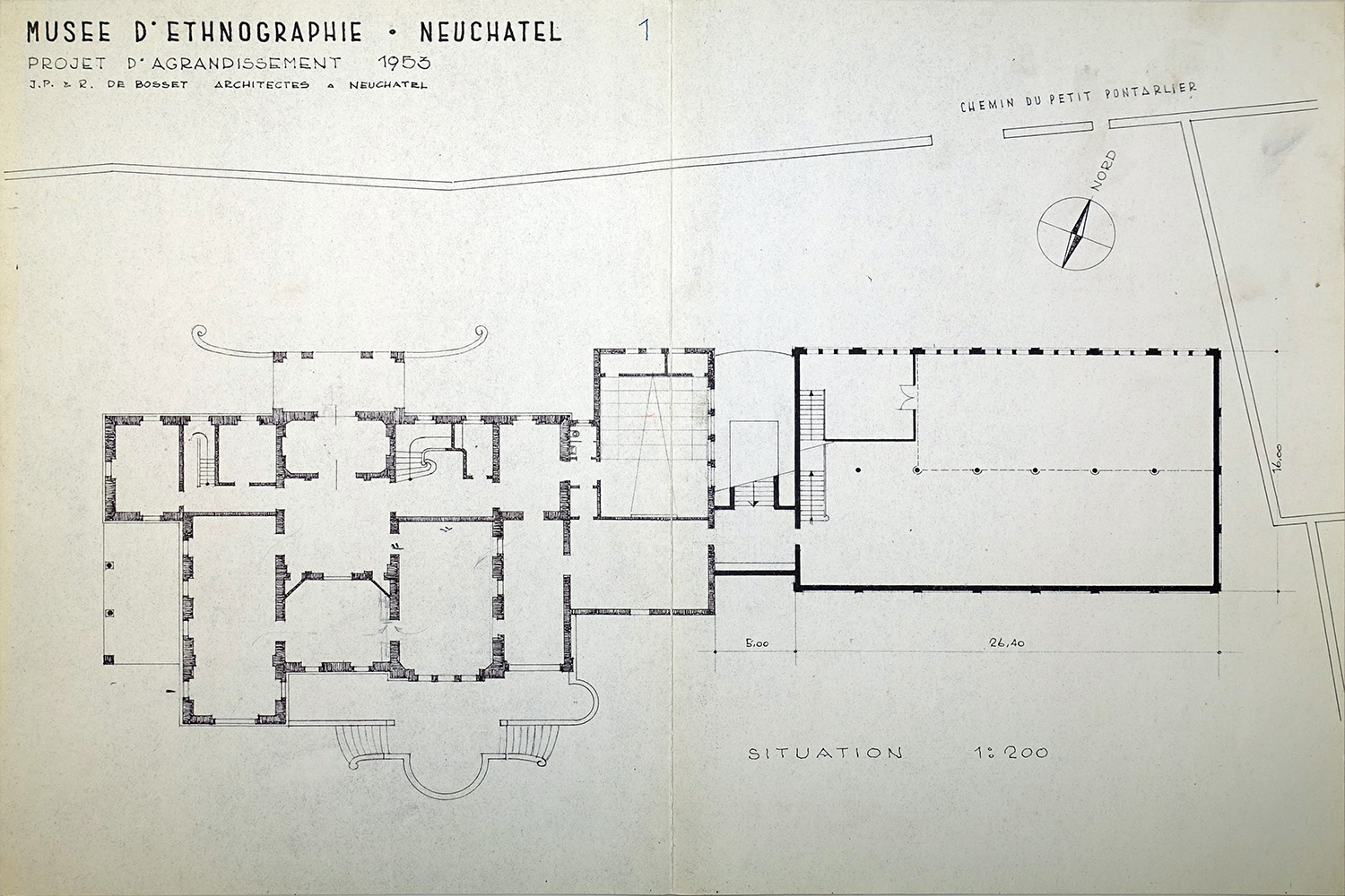Fig 1. Plan Musée d’ethnographie, projet d’annexe à l’est pour locaux d’exposition et magasins, échelle 1 :200, Jean-Pierre et Renaud de Bosset, mai 1953. Archives Musée d’ethnographie, Neuchâtel.