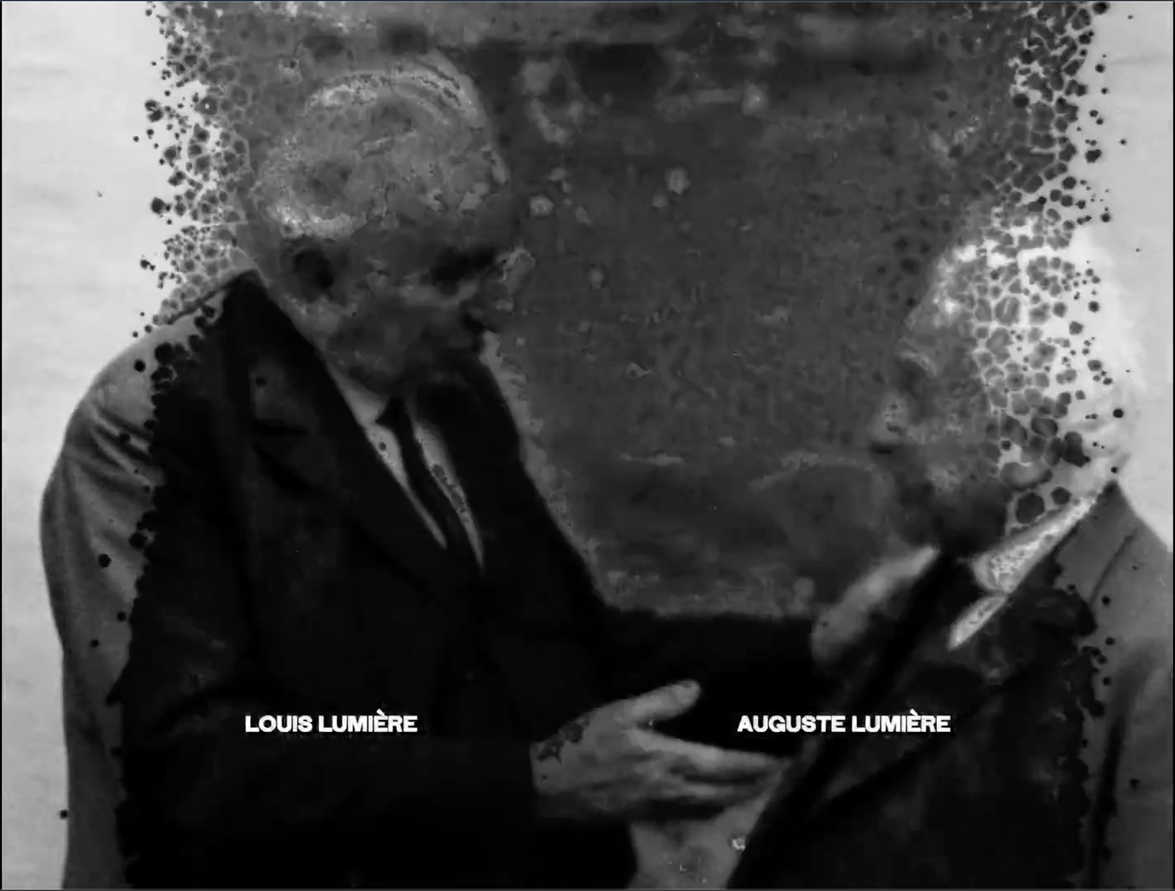 Deuxième retour de flamme : Dans les films de found footage de Bill Morrison8, la décomposition organique de la pellicule nitrate sert aussi bien le récit filmique que la méditation du cinéaste sur le temps et la perte. Contrairement à Yervant Gianikian et Angela Ricci Lucchi, la relecture des images proposée par Morrison est donc plus esthétique qu’analytique. Quelques plans cependant, dont l’un montre les frères Lumière littéralement effacés par ce devenir incendiaire de la pellicule (cf. image 1)9, témoignent sous la forme de la hantise d’une parenté des origines troublante que les gens veulent oublier.