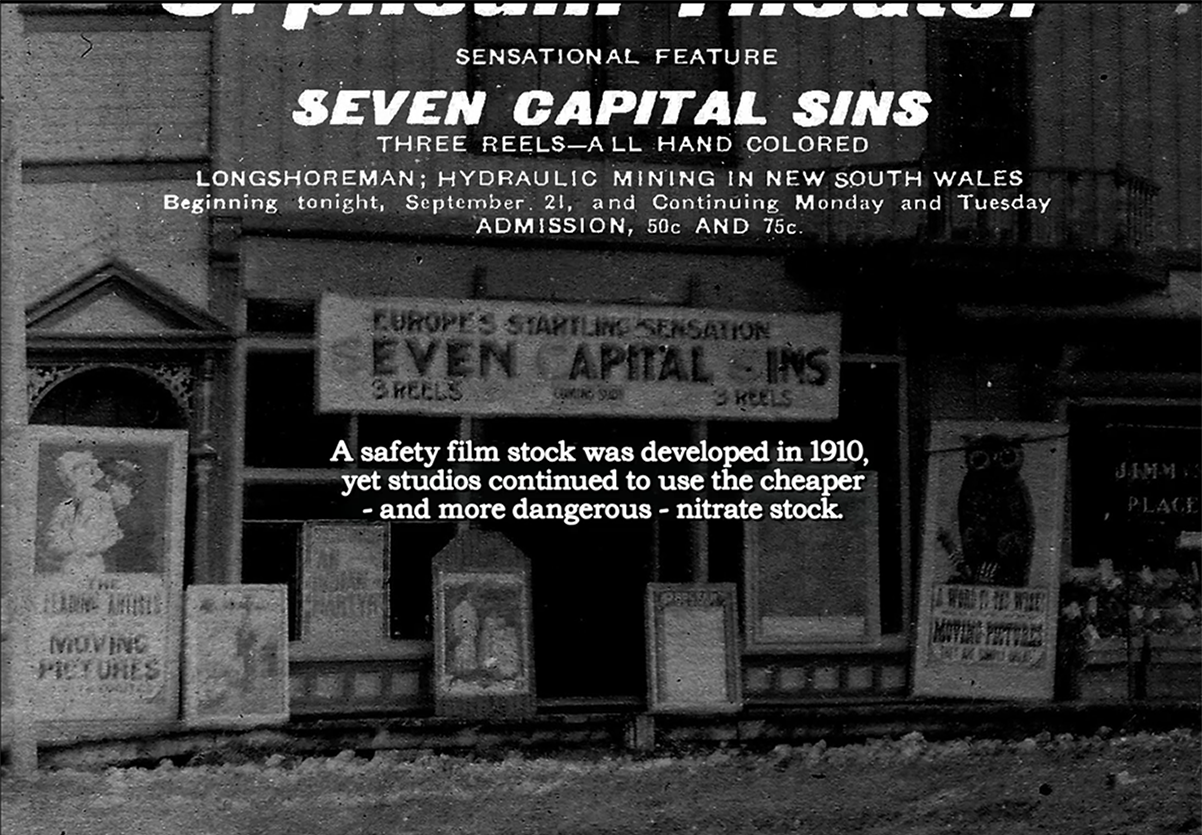 Dans Dawson City : Frozen Time, un plan explique qu’une alternative au film nitrate existait dès 1910 (cf. image 6). En effet, à la fin de l’année 1908 la société Eastman-Kodak annonçait la mise en vente prochaine de films incombustibles. « Dès lors, on était en droit d’attendre un abandon progressif de la pellicule nitrate. Il n’en fut rien14. » La compétition économique que se livrent l’Europe et les États-Unis d’Amérique pour le monopole de la production du film ininflammable et le fait que le support acétate permette de réaliser un nombre moins élevé de projections d’une même copie expliquent pourquoi les incendies continuèrent à se succéder pendant plusieurs décennies. Autrement dit, les pellicules les plus fragiles, en ceci qu’elles s’abîment plus rapidement, sont aussi les plus sûres – mais les moins rentables. Il n’est donc pas à l’avantage des sociétés d’édition et des exploitants d’en favoriser l’adoption et « les intérêts commerciaux et la mauvaise fois de la corporation finirent par l’emporter sur la sécurité des spectateurs15. »