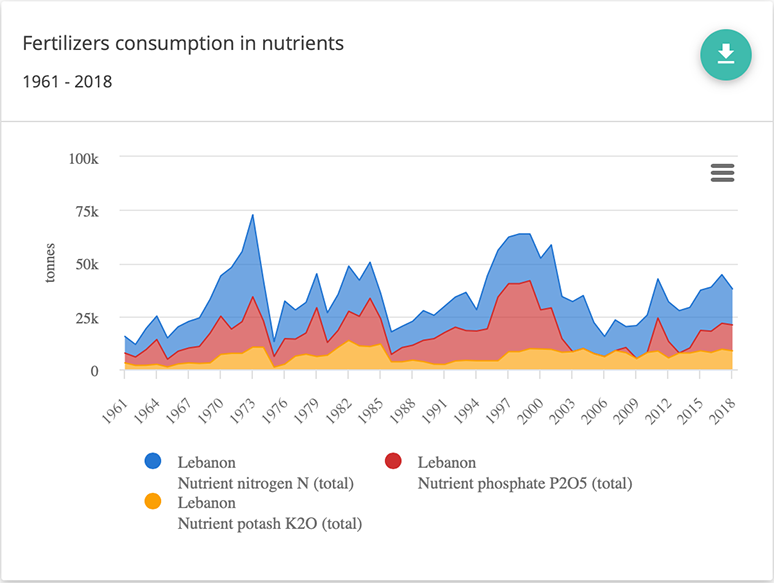 Consommation d’engrais (parmi lesquels les engrais azotés) au Liban, Source : http://www.fao.org/faostat/en/#country/121
