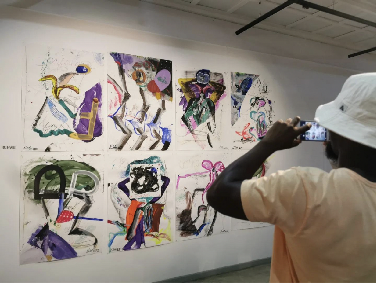 Fig. 5. Titos Pelembe, partial view of the work by Ilídio Candja Candja (2022), “Vodu I–XIII,” various dimensions, mixed media on paper.