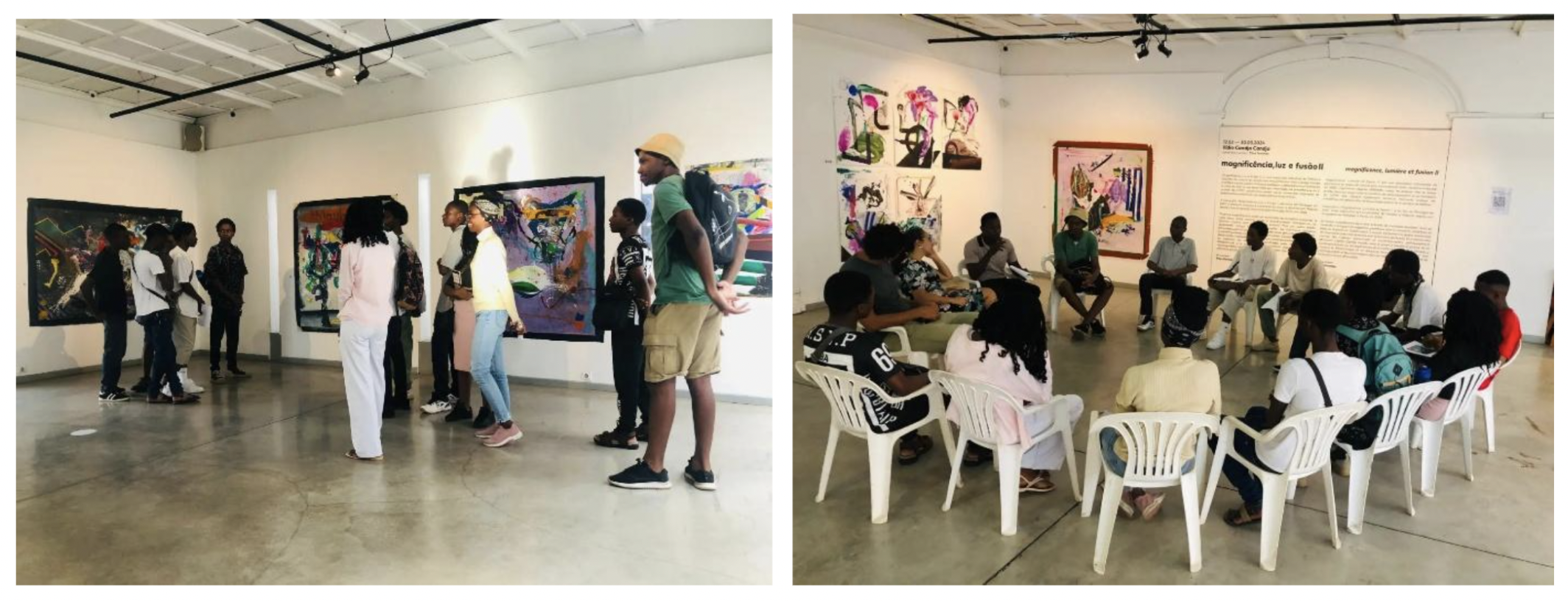 Figs. 6 and fig. 7. Moments of interaction with ISArC students following the guided tour that I led as the curator ot Ilídio Candja Candja’s work at the Franco-Mozambican Cultural Centre in Maputo in 2024.