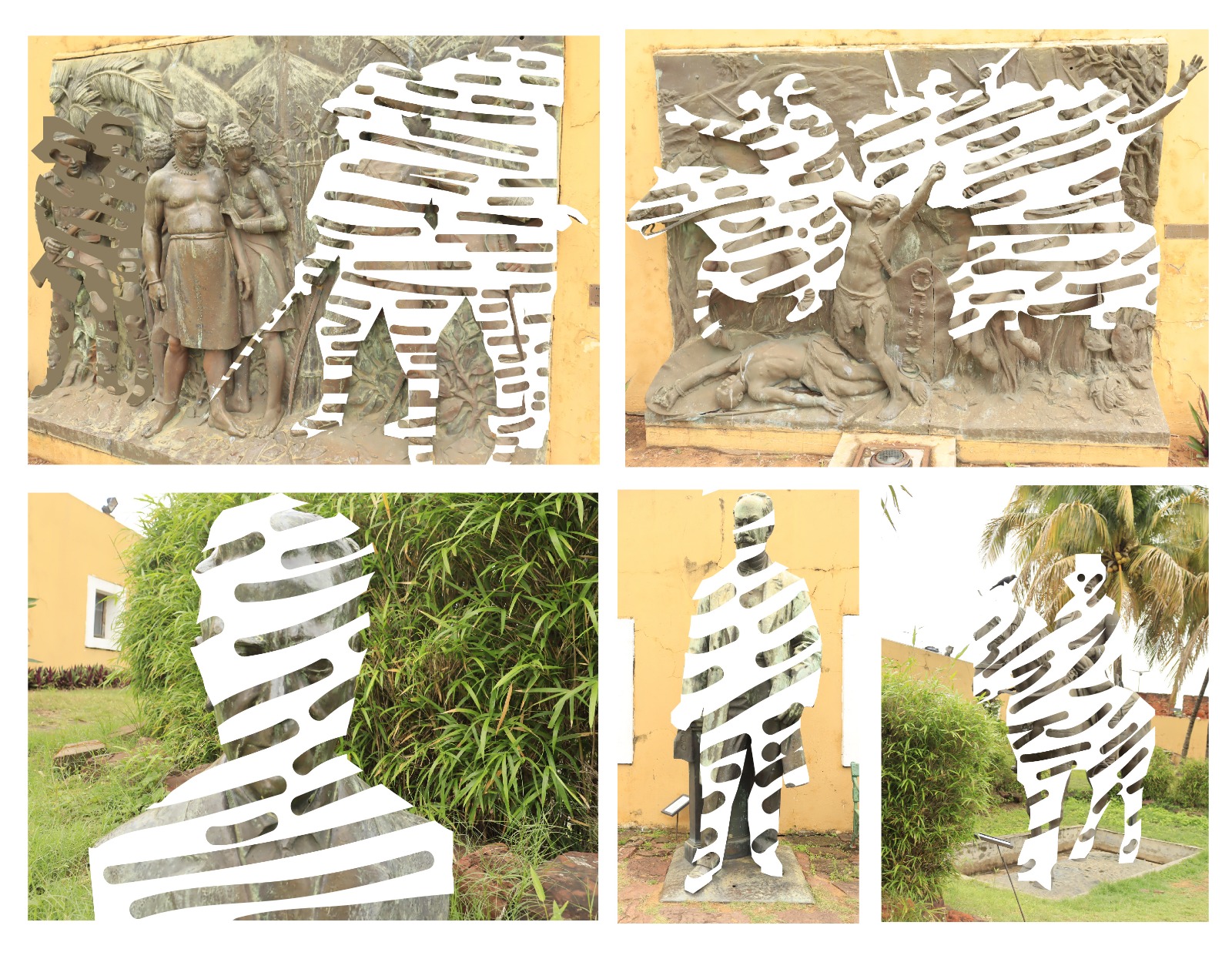 Fig.group 1: Titos Pelembe, “Decapture Ngungunhane protected by the Queens of the Gaza Empire” (2025). Digital intervention on a photograph of the colonial monument exhibited at the Fortress of Maputo.