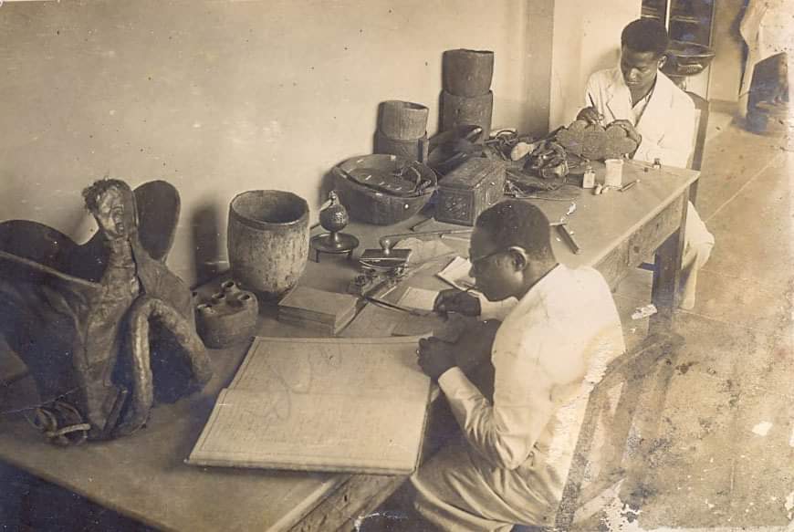 Restauration des objets au premier étage du musée de l’IFAN, années 1950 © Le Musée de Dakar, ouvrage de Francine Ndiaye.