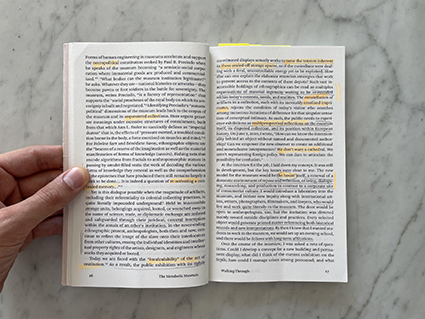 C’est dans ce moment de doute sur le système muséal que le souvenir du Weltkulturen Museum, quelque peu mis en sommeil depuis ce séjour à Francfort en 2016, renaît par la lecture de The Metabolic Museum de Clémentine Deliss, paru quelques mois plus tôt. Sa forme – un petit livre de 120 pages, à la couverture souple d’un discret rose pâle, et qui se glisse parfaitement dans la poche – autant que son style vif ou son ambition programmatique, lui confèrent un caractère de véritable « Petit Livre rose », capable d’enflammer les esprits de professionnel·le·s de musées désenchanté·e·s. Dans ce texte, l’autrice réunit un matériau déjà formulé par le passé dans plusieurs écrits1, mais qui gagne ici en force et en unité par son inscription dans le récit minutieux de ses cinq années passées à réinvestir une institution qu’elle estime à bout de souffle. Entremêlant plusieurs temporalités, échelles d’observation et formats (emails, fragments poétiques, documents de travail, etc.), les chapitres alternent ainsi plongée dans les lieux du musée, retours sur des épisodes marquants de sa vie de curatrice cosmopolite (comme l’aventure de la revue Métronome entre 1996 et 2007) et critique redoutable des néo-musées d’ethnographie depuis le point de vue de leur architecture, de leur passé colonial refoulé, de leur rapport ambigu à la valeur et à l’authenticité et, surtout, de leur manque cruel d’imagination. Cette déconstruction en règle s’appuie sur l’immersion de Deliss dans les archives, les réserves, les rayonnages de la bibliothèque ou le studio photo du Weltkulturen Museum, lui permettant de décrire de façon quasi haptique le choc sensoriel provoqué par la physicalité d’un musée malade — « The place smelled of a mixture of cowhide, fermented milk, and citric moth repellent » (p. 40).