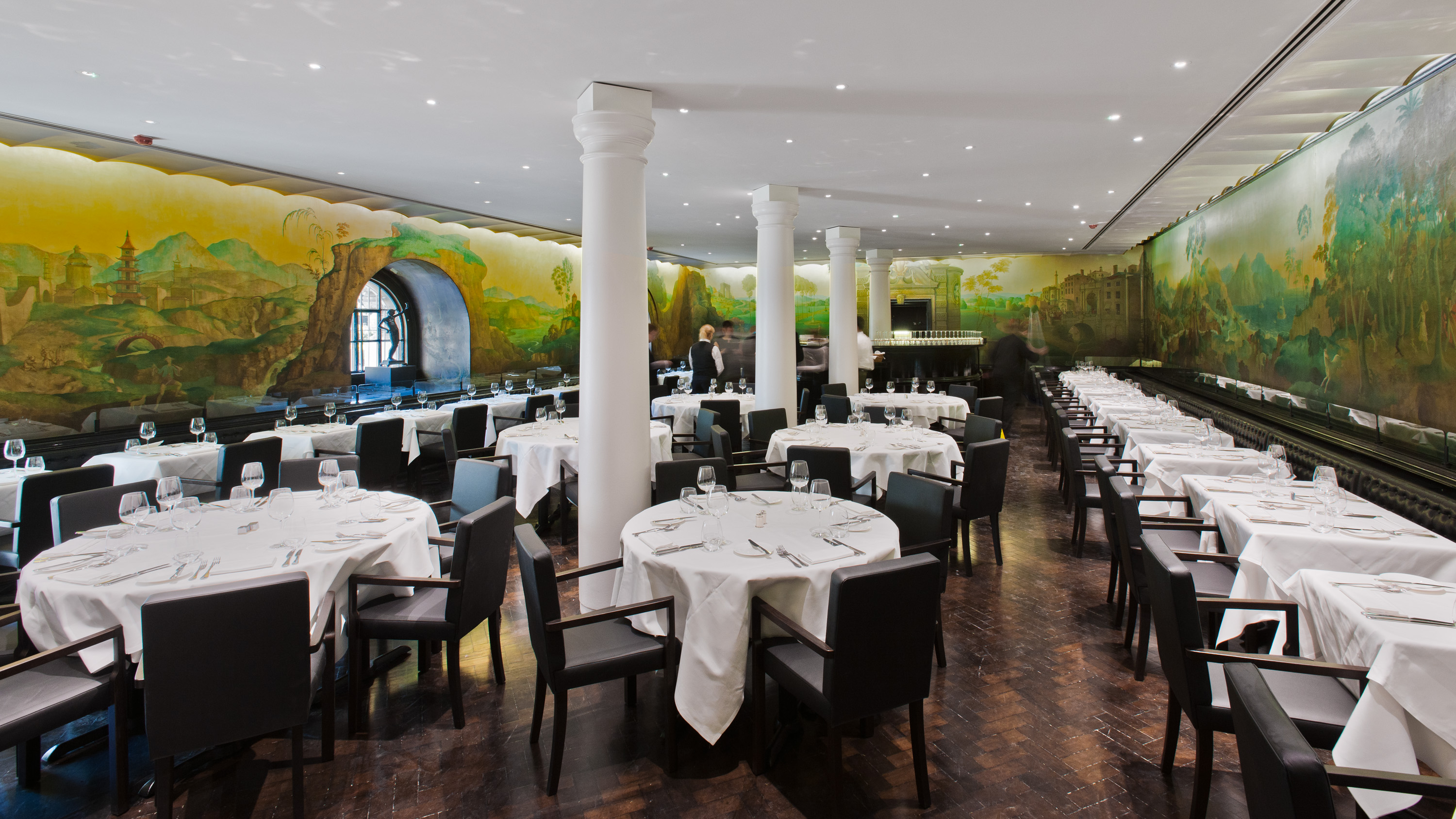 Le restaurant Rex Whistler à la Tate Britain, Londres, avec la peinture murale The Expedition in Pursuit of Rare Meats deRex Whistler, 1927 © Tate photography. La fresque a été qualifiée de raciste par des militants tels que White Pube, en raison de la représentation d’enfants noir.e.s esclavagisé.e.s et de caricatures de personnages chinois.