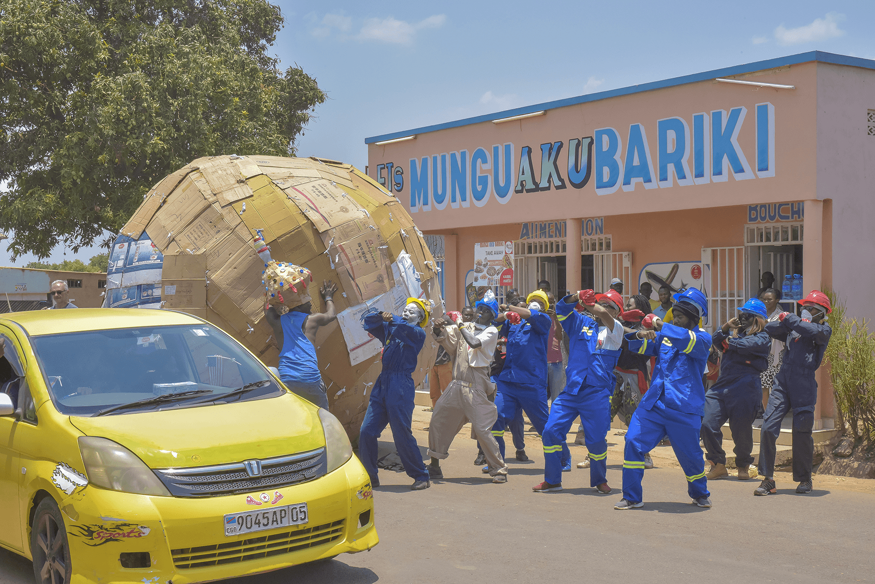 L’année 2019 m’a doublement amené à Lubumbashi : j’étais artiste invité à la Biennale afin de montrer mon travail, et en amont, les Ateliers Picha m’ont donné une carte blanche pour animer pendant dix jours un atelier avec des jeunes performeuses et performeurs lushois.es. J’ai donc élaboré ma performance Kesho avec ce groupe, dans un processus où ils et elles m’ont accompagné.e.s dans sa conception, sa création puis pour la performance dans les rues de Lubumbashi. Ce groupe de jeunes gens était très motivé mais très peu formé en matière de performance. On a beaucoup discuté sur les formes performatives, sur leur relation à l’espace public, sur le rôle des costumes… ce qui a permis de problématiser ce que nous allions mettre en acte, de mieux en comprendre les enjeux. Puis, nous avons poursuivi l’atelier sous forme pratique, pour mettre en place ma performance Kesho, ce qui signifie « L’avenir » en swahili. Ce titre pointe qu’il faut prendre l’avenir en charge – personne ne va le penser à notre place ! Il s’agit de dire « Vous avez droit à y croire et de vous y confronter sur la base de vos envies ! »