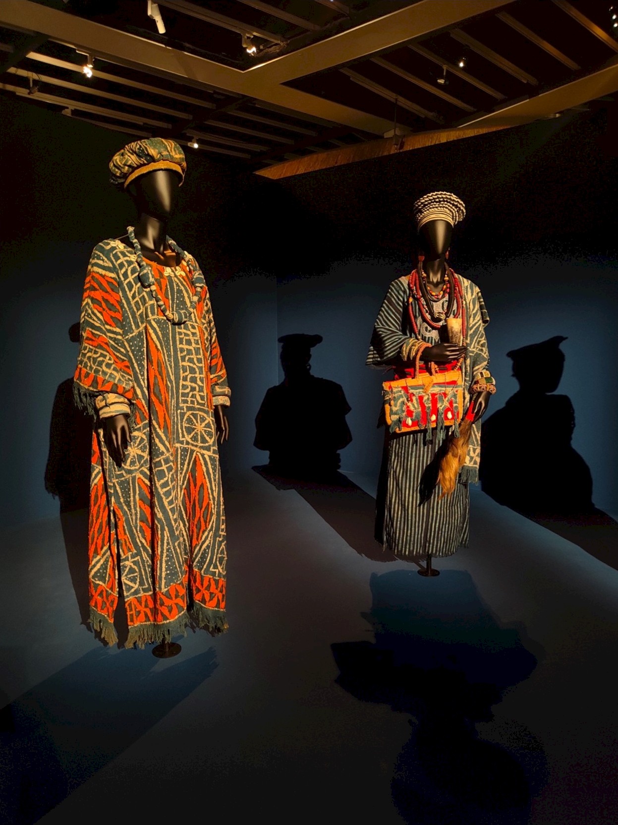 Figure 1. Vue d’une partie de l’exposition « Sur la route des chefferies du Cameroun. Du visible à l’invisible », Musée du quai Branly, 05.04-17.07.2022, présentant des costumes traditionnels et accessoires de reines-mères, image : Bansoa Sigam.