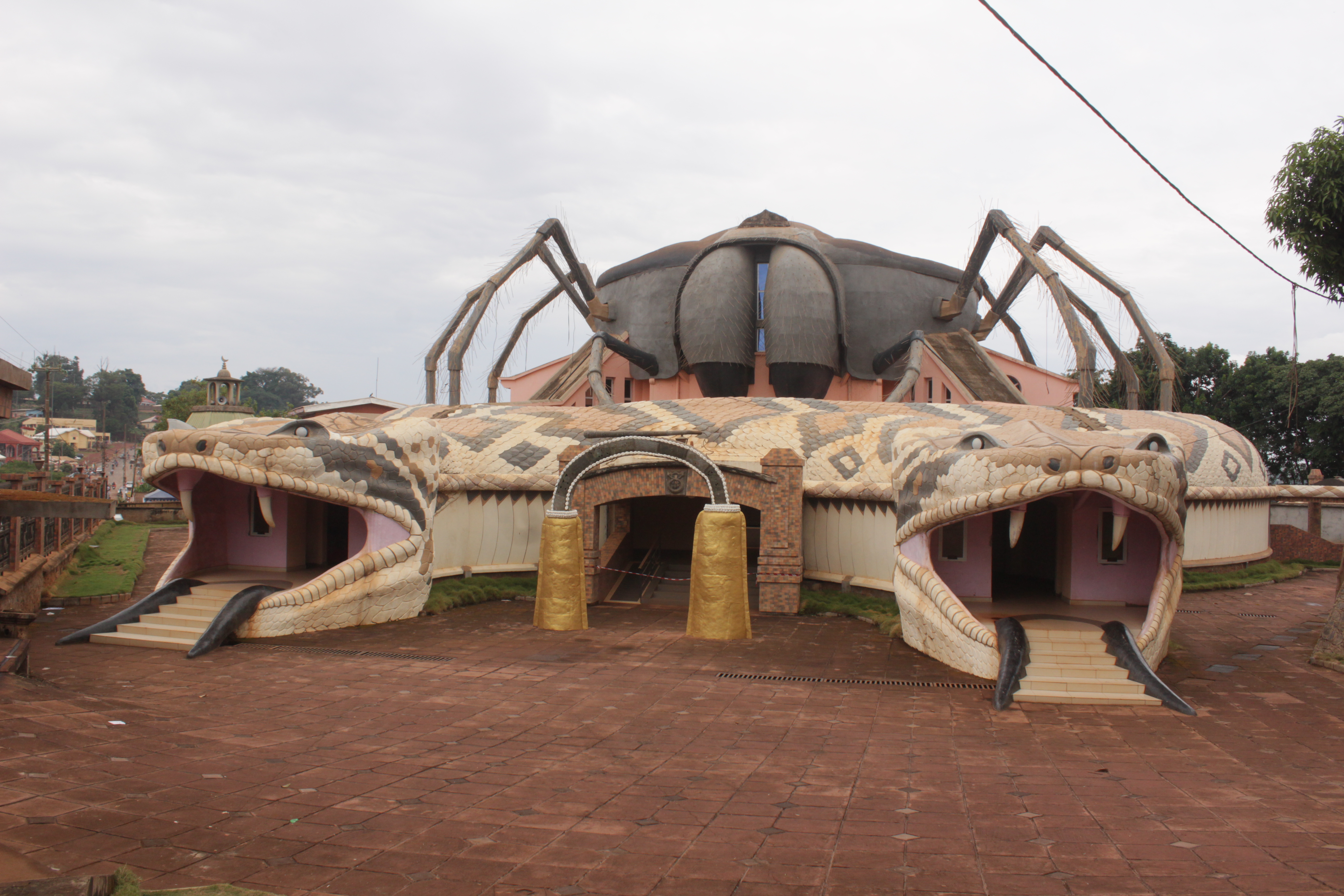 Le Musée des Rois Bamoun se dresse au cœur de la « cité des arts », Foumban, à côté du palais royal. Sa célébrité découle de son style architectural : un musée sous forme de serpent à deux têtes, surmonté d’un dôme qui est lui aussi un animal, la mygale. Tel un arc-de-triomphe, se dresse à l’entrée principale une cloche à double gong dorée. Sa renommée provient aussi de sa collection de 12 500 objets qui retracent l’histoire des souverains et du peuple bamoun. Photo HTN, 2022.