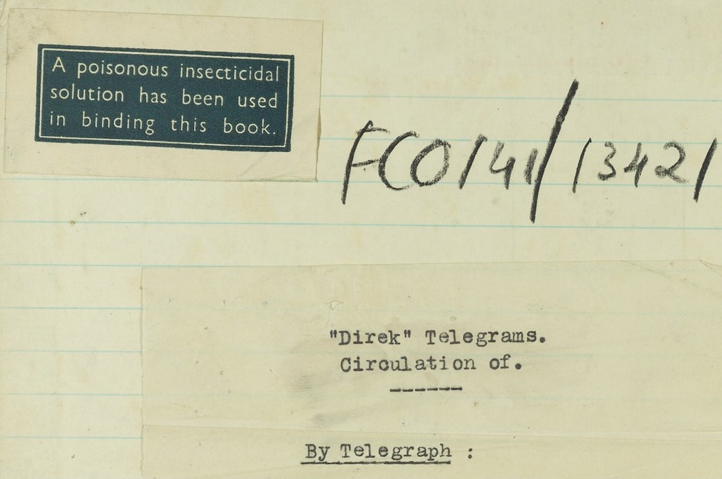 In 2022 The National Archives UK embarked on a project to digitise the FCO 141 record series commonly known as the “migrated archives”1 – records from former British colonial administrations. During their conservation assessment, our Conservation for Digitisation team noted that some records bore a label: “A poisonous insecticidal solution has been used in binding this book”. This observation set-in motion a standard internal scientific analysis request, which revealed the nature and scale of insecticide use on administrative records bound for or produced in the “tropics”. Although such practices are well-known and discussed in museum collections, to our knowledge, there was no such precedent in the archive and library sector. The records in FCO 141 were withdrawn from the Reading Room, and over the following five months testing was carried out to determine the nature of the insecticide traces on the records and their potential for harm.