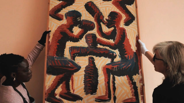 Nous disposons donc de deux archives, le panneau et le film de Landier qui nous servent de point de départ. Notre premier travail commun est d’en extraire celles qui nous intéressent en fonction de notre expertise respective. Dès les premiers visionnages, je me concentre sur les indices qui me permettent de comprendre au mieux la mise en œuvre du tableau, les conditions de réalisations et les matériaux utilisés afin de déterminer les altérations notables à travers le temps. Sur des plans furtifs, on voit Mwenze travailler, tremper son pinceau dans la peinture diluée et tracer les différentes scènes.