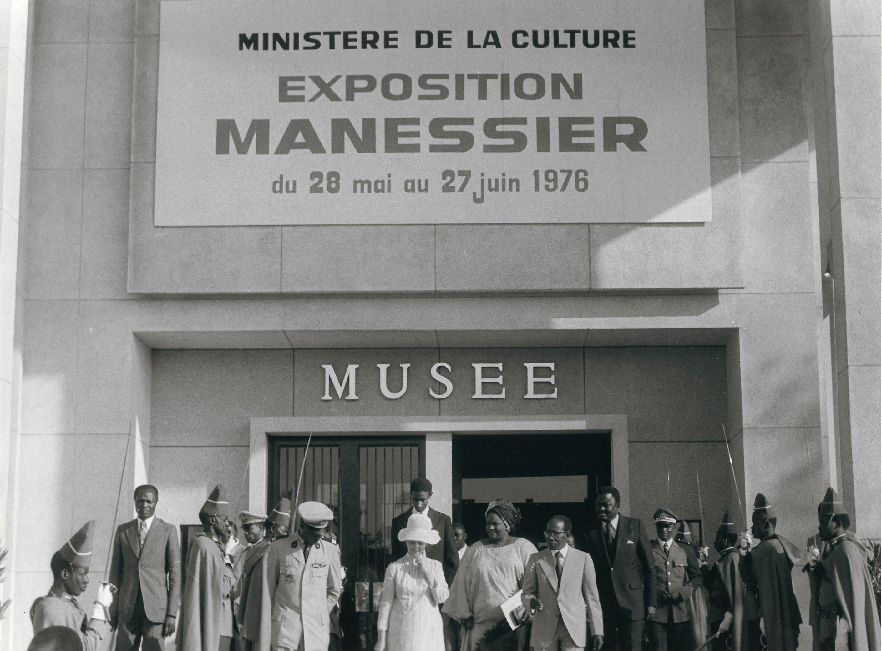 Figure 1. Fronton du Musée dynamique. De droite à gauche : Alioune Sène, ministre de la Culture, Léopold Sédar Senghor, madame Sène, Colette Senghor, Abdou Diouf, 1976, archives Manessier, Abbeville (droits réservés).